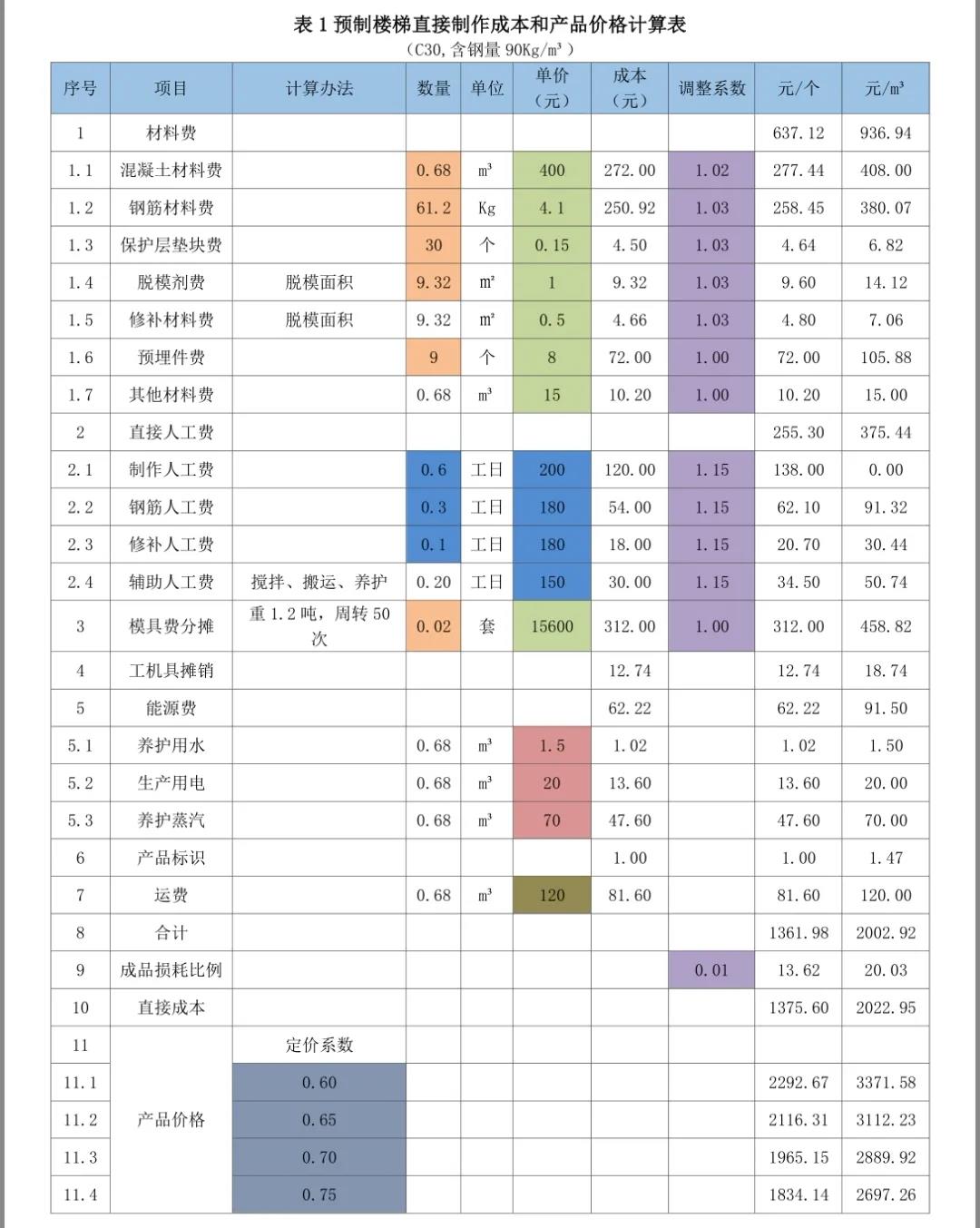 以下分享摘自红宝书之《装配式混凝土建筑——如何把成本降下来》,是从构件厂家的角度进行的价格组成介绍,亦可用于对预制构件价格合理性判断的方法。2)然后计算费用(包括间接制作成本、营销费用、财务费用和管理费用)、税费和利润这三个方面在价格中的比例。3)用100%减去上述的比例,就得到了定价系数——直接制作成本在价格中的比例。4)用直接制作成本除以定价系数就得到了预制构件价格。即:预制构件价格=直接制作成本/定价系数。通过成本要素统计法,计算得到某一类预制构件的直接制作成本是1800元/m3。通过对以往数据的统计和计划预算的分析,确定费用(包括间接成本、营销费用、财务费用和管理费用)占预制构件价格的比例为20%。通过对增值税抵扣情况的统计分析和土地使用税和房产税的分摊,税费占预制构件价格的比例为10%。汇总上述比例,该构件的费用、税金、利润占预制构件价格比例的合计为40%。100% - 40%=60%;定价系数为0.60。需要注意的是,在计算和确定预制构件的定价系数时,要根据费用分摊占预制构件价格的比例、预期的利润率和税费在预制构件价格中的比例,根据市场行情的分析,根据企业状况和定价策略等因素确定。预制构件销售价格=直接制作成本/定价系数=1800/0.60=3000元/m3。也可以用Excel表方便的进行预制构件直接制作成本和产品价格计算。以下测算表格为举例说明,各项数据仅供参考。表3预制夹芯剪力墙保温板直接制作成本和产品价格计算表;1)成本栏为数量栏与单价栏的乘积;调整后成本栏为成本栏与调整系数栏的乘积;小计为各分项成本的合计;每个预制楼梯、每平方米叠合楼板、每个预制柱、每个预制梁、每块预制夹芯保温板造价为直接成本除定价系数;每立方米造价为每个预制楼梯造价、每平方米叠合楼板、每个预制柱、每个预制梁、每块预制夹芯保温板造价除混凝土材料数量。2)在表里只要填写或修改相关项目数量、单价、调整系数及定价系数(表中标记有颜色的部分),就会得到预制构件的直接制作成本和不同定价系数下的产品价格。①材料数量、模具费计算使用的数量由技术部门提供(橘色)。②材料单价、模具单价(以下各表均按13元/Kg)由采购部门提供(混凝土如果是企业自产的话,价格可以另行计算而得)(绿色)。③人工费数量和单价由人力资源部门协同定额管理部门提供(蓝色)。④工机具摊销(以下各表取材料费的2%)由财务部门提供。⑤每立方米预制构件需要的水、电、蒸汽费由能源管理部门提供(黄色)。⑥每立方米预制构件运费由运输管理部门提供(土黄色)。4)材料和成品考虑到损耗,增加了调整系数(紫色)。5)人工费调整系数是指工资中还应包括劳动保险、公积金、工会经费、其他福利费、劳保费用,劳务公司工人包括劳务公司的管理费等,适当分摊淡季待工时的人工费用。本章内容节选自红宝书之《装配式混凝土建筑——如何把成本降下来》,购买请点击下面小程序:(注:苹果手机用户,请点击文末“阅读原文”)